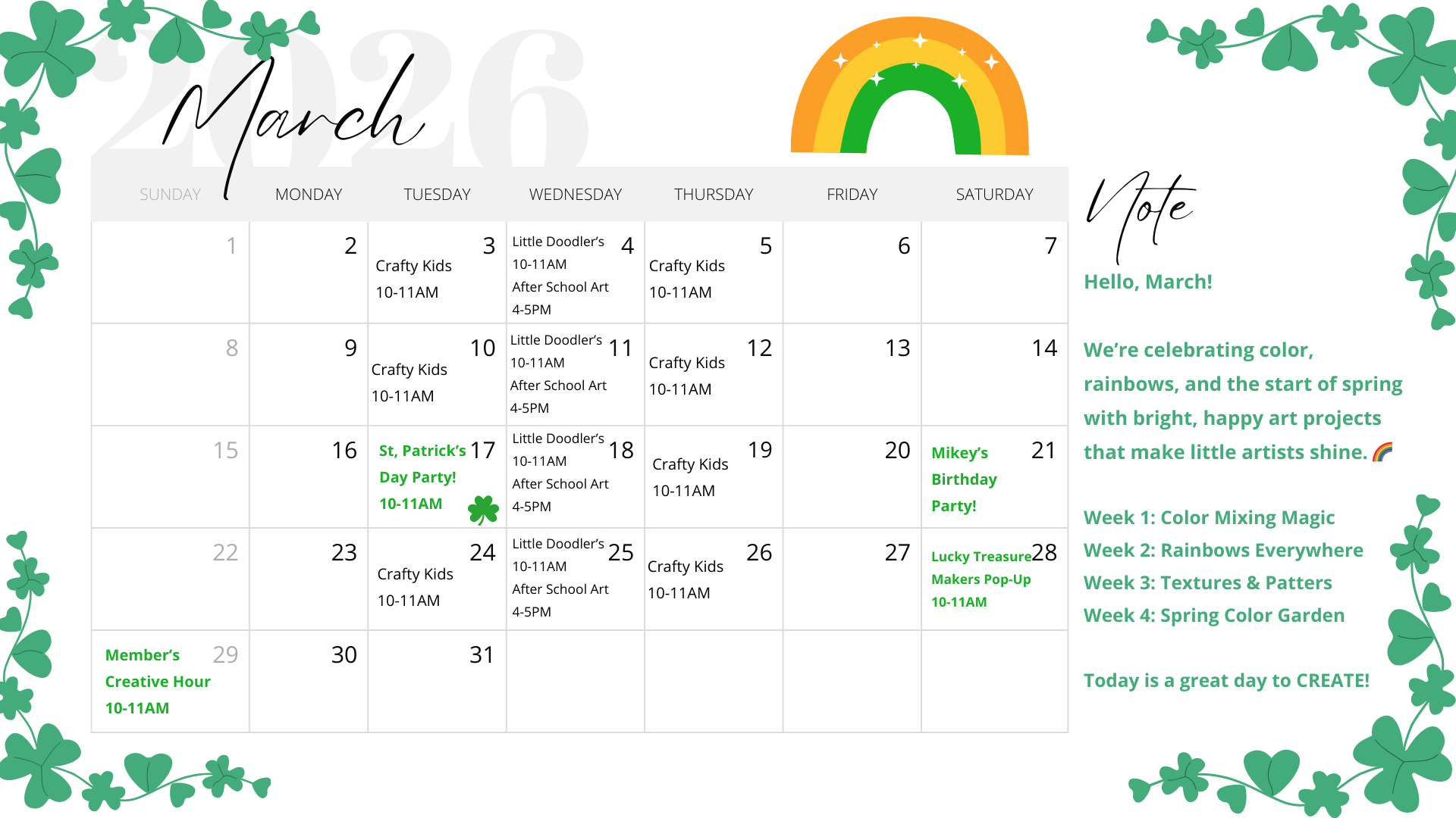 Each session wraps up with a snack and storytime — blending art, play, and learning into the perfect creative adventure!